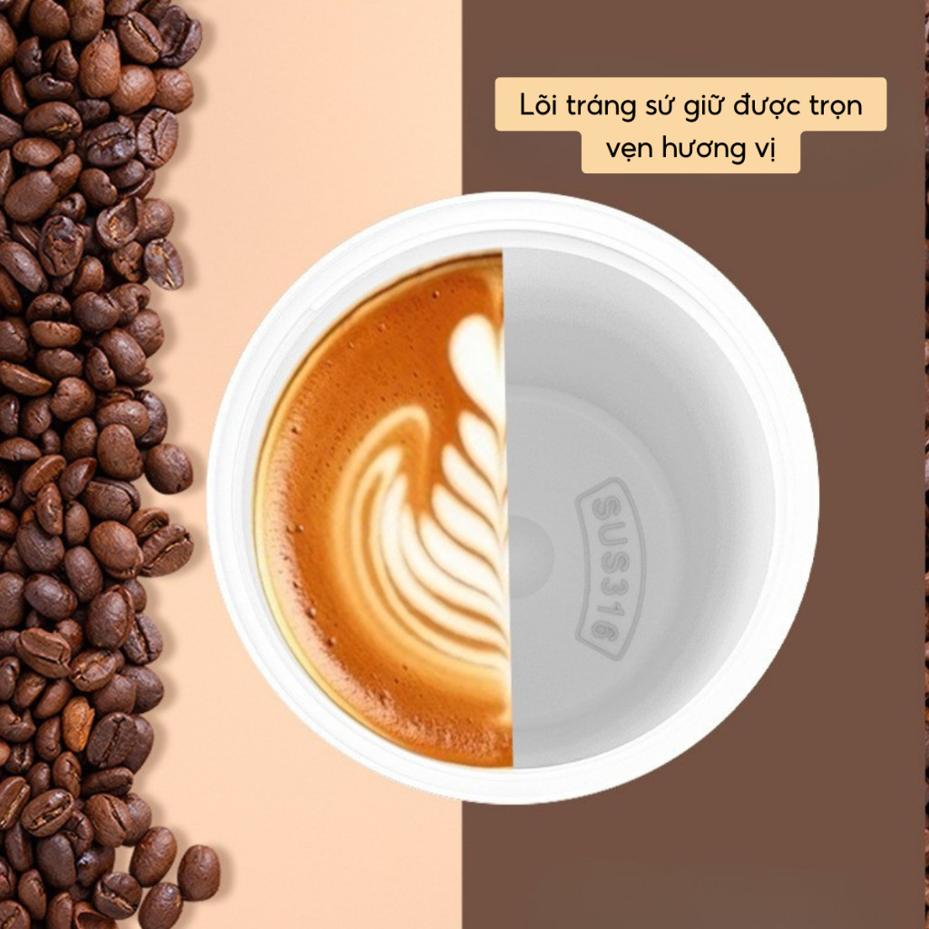Chất liệu lòng ly: Được làm từ Inox 316 cao cấp, một trong những chất liệu inox bền bỉ và an toàn nhất hiện nay. Lớp tráng sứ bên trong giúp bảo vệ đồ uống khỏi việc ám mùi và dễ dàng vệ sinh, mang đến trải nghiệm sử dụng lâu dài mà không lo về mùi hương cũ hoặc cặn bẩn.